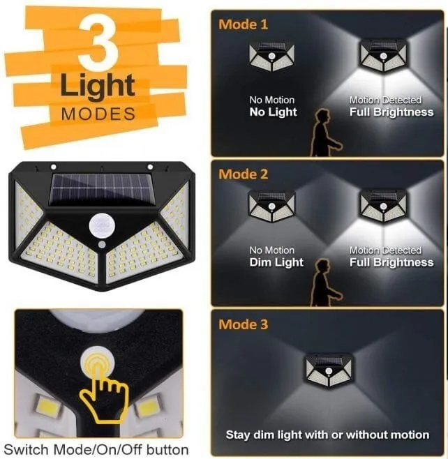 Esta luz solar LED de 100 LEDs funciona sin cables, sin electricidad, y se carga automáticamente con energía solar. Es resistente, impermeable IP65 y perfecta para exteriores como patios, jardines, cocheras, entradas y más.